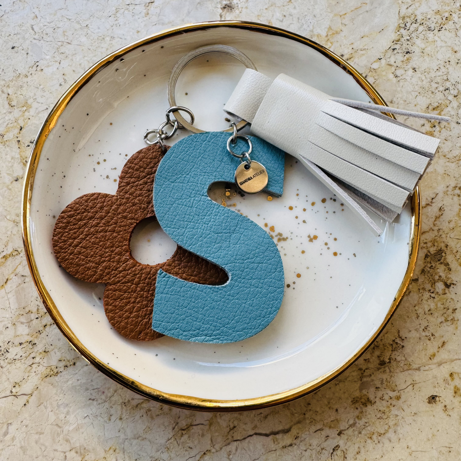 Breloc din piele naturala creat manual cu ciucure si litera S. Poate fi purtat la geanta, la chei, este simplu, dar elegant, culori usor de asortat. Poate fi un cadou inedit pentru cineva drag.