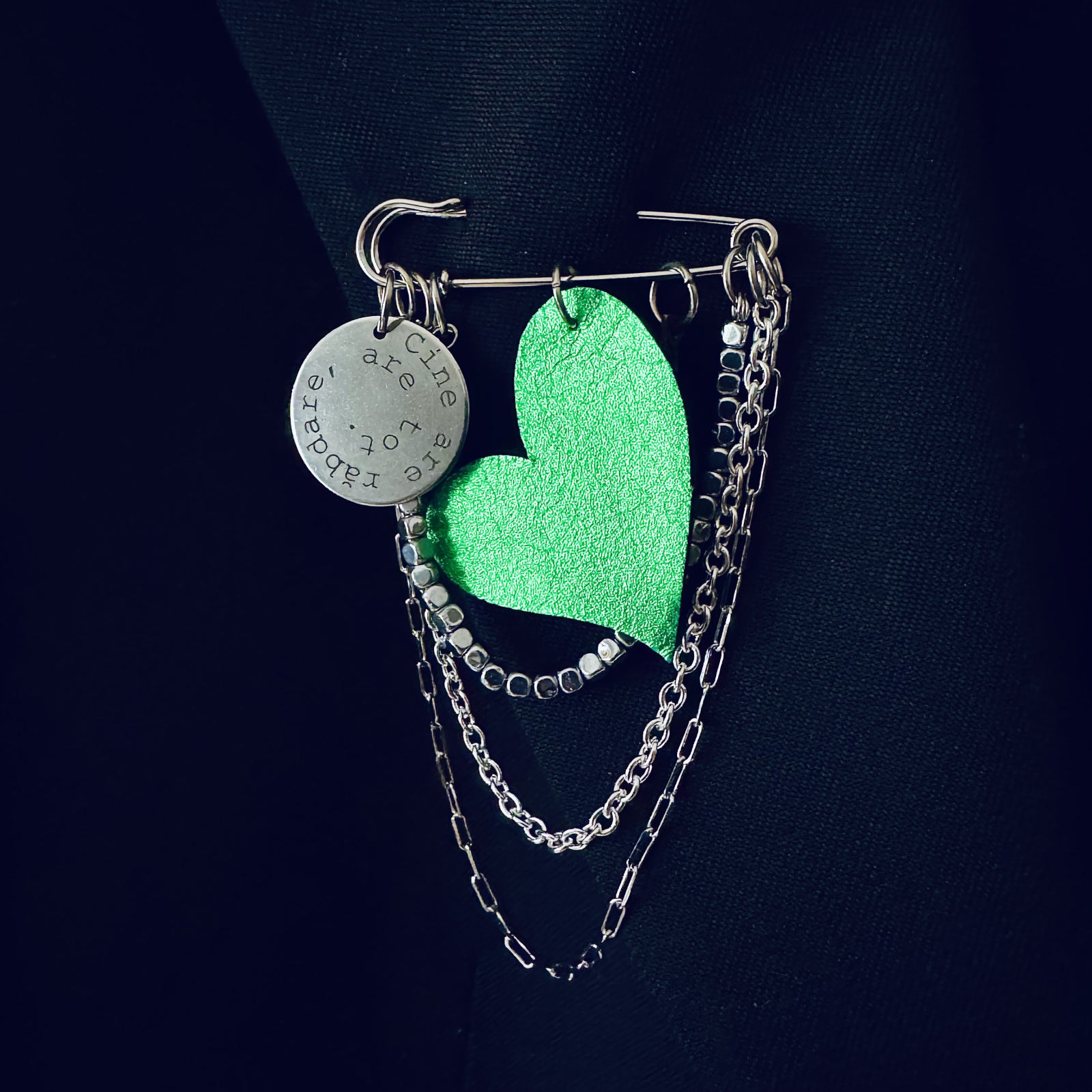 Brosa piele si banut gravat cu ac mare cu mesajul "Cine are rabdare, are tot". Banut de otel inoxidabil de 23mm, lanturi din inox si pietre de hematit