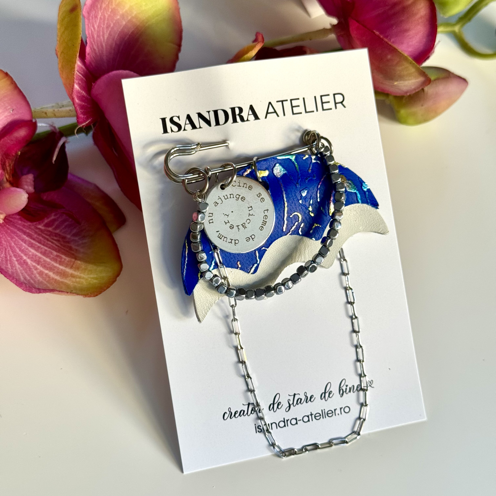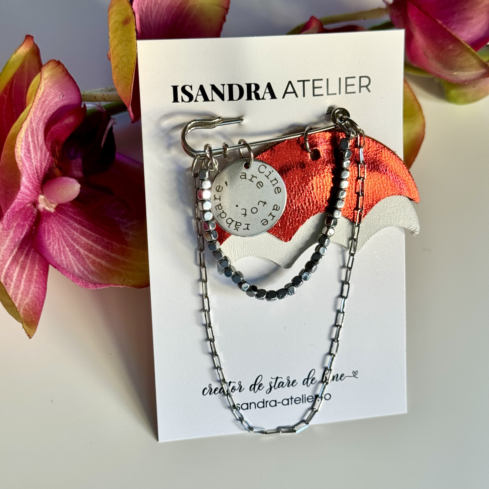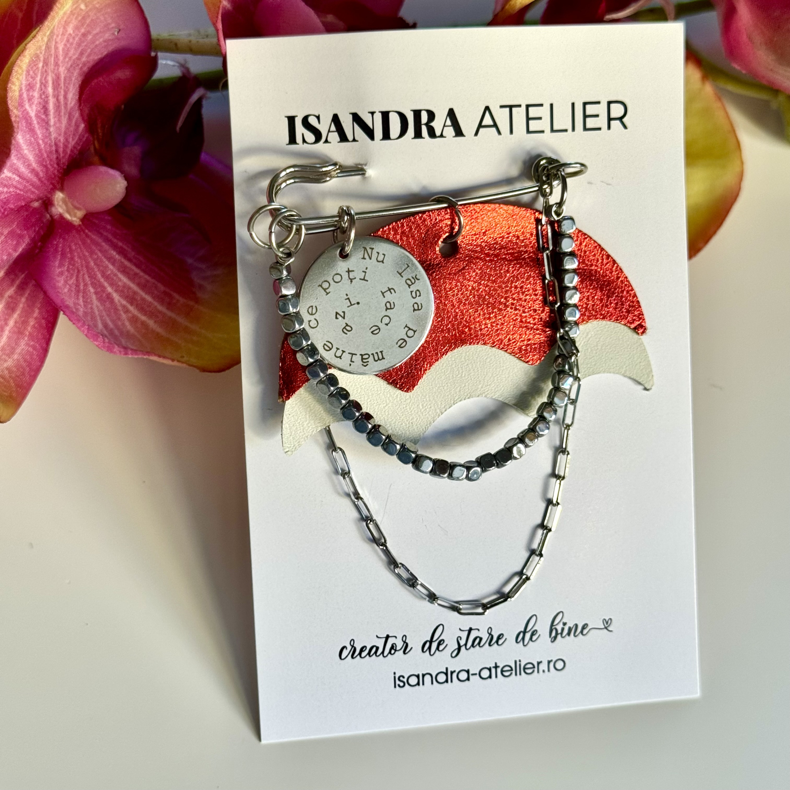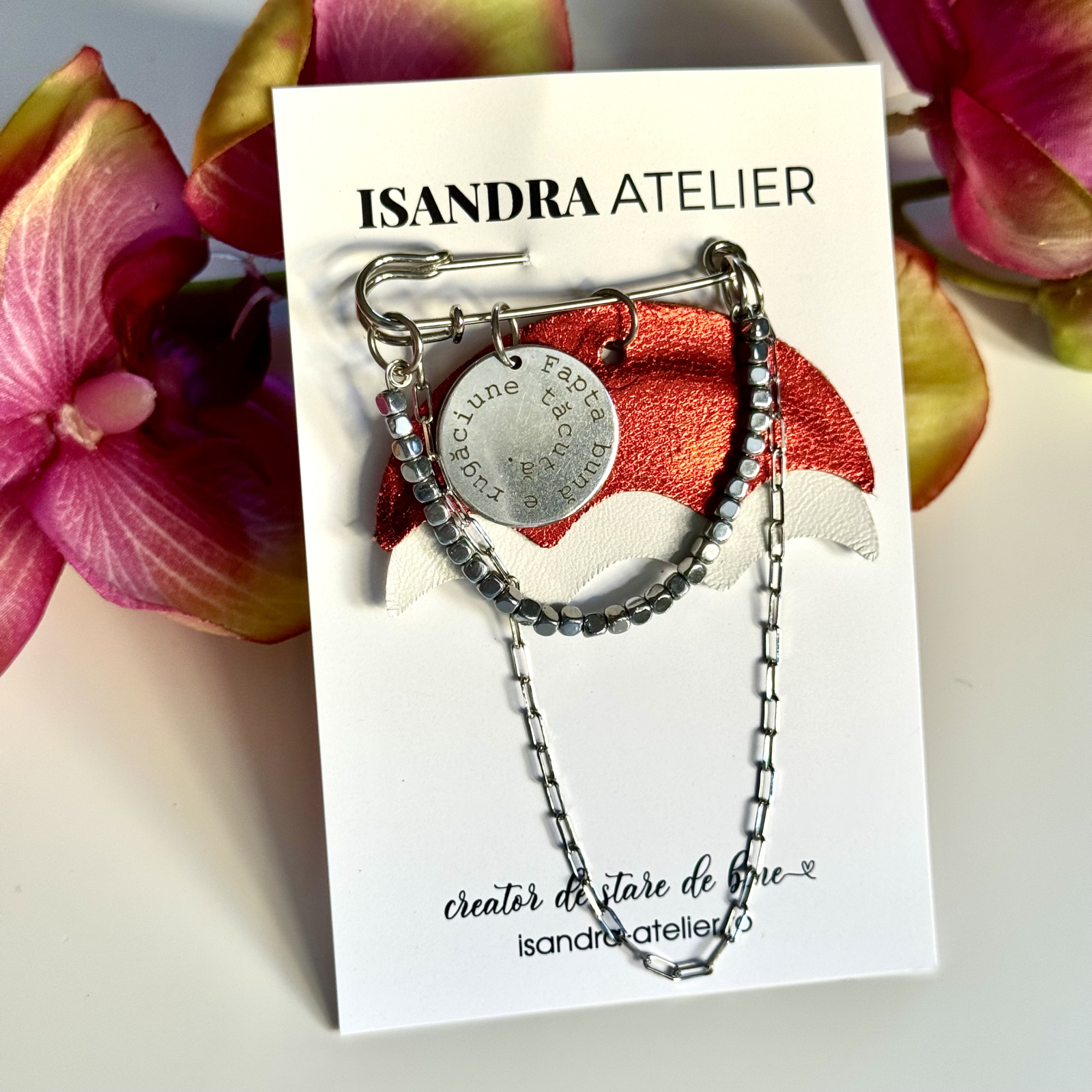 Brosa piele si banut gravat cu ac mare cu mesajul "Omul bun lasa urme frumoase". Banut de otel inoxidabil de 23mm, lanturi din inox si pietre de hematit