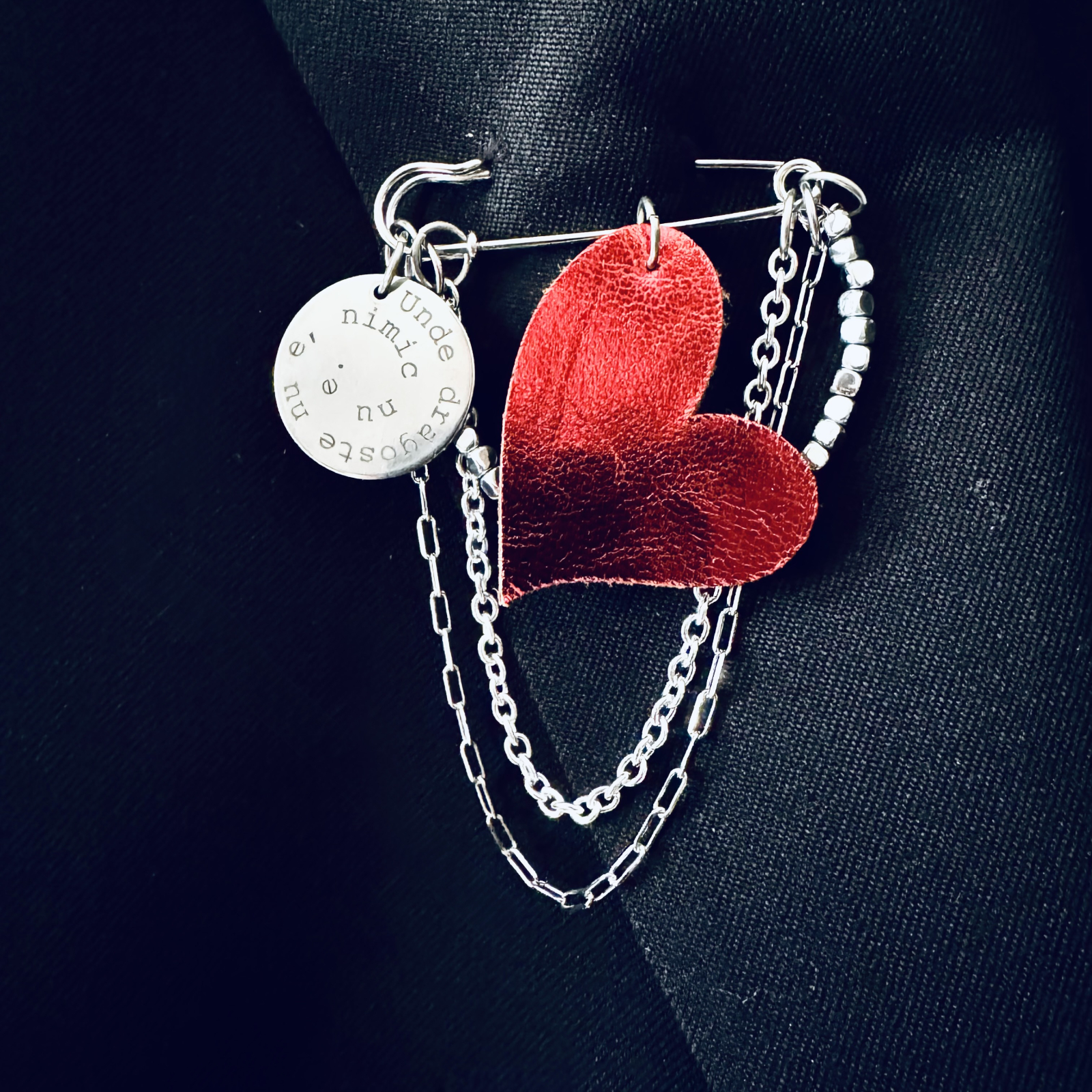 Brosa piele inima si banut din inox gravat "Unde dragoste nu e, nimic nu e". Banut de otel inoxidabil de 23mm, lanturi din inox si pietre de hematit.