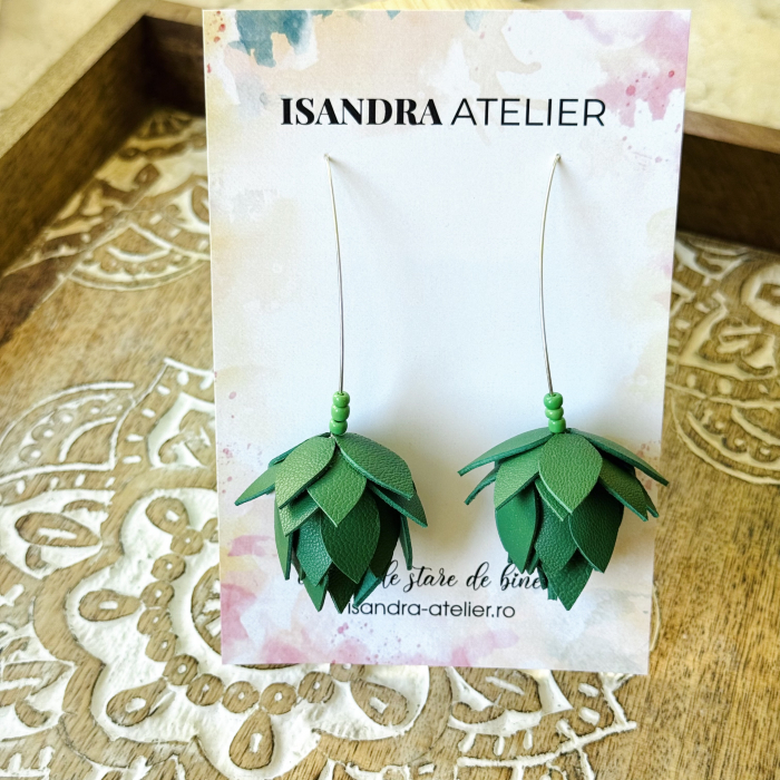 Cercei ghinda cu petale aplicate de piele naturala, pe tija lunga de argint. Mobili, delicati, cu o forma ce complimenteaza un gat lung, eleganti, potriviti pentru o tinuta de dupa amiaza sau ocazii.