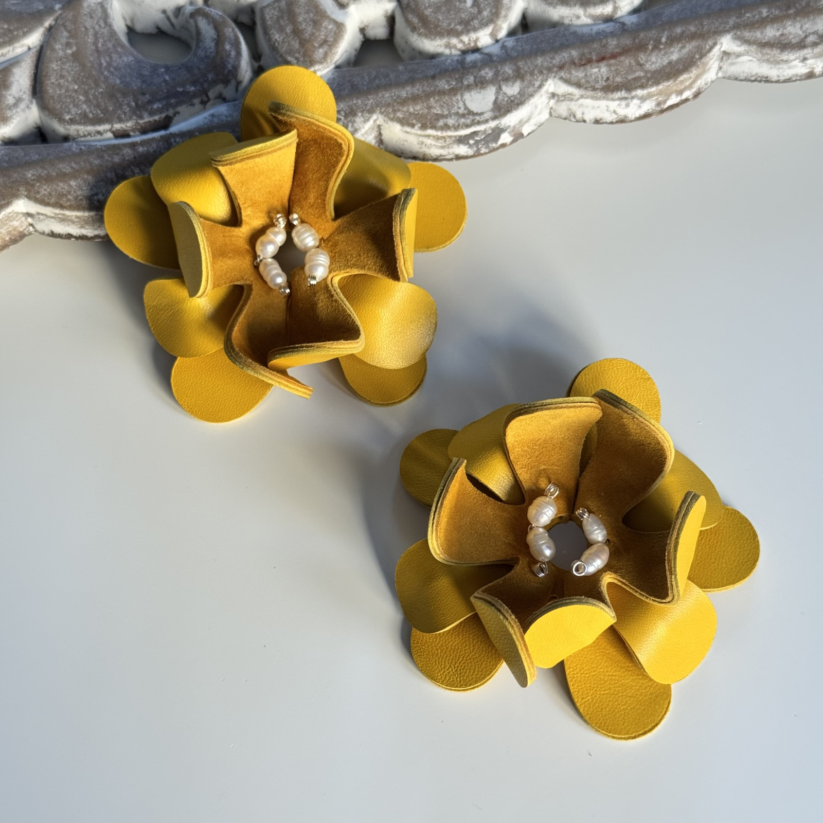 Cercei piele naturala anemona galbena. Piele naturala si piele intoarsa intr-o pereche de cercei floare deosebit de eleganti si usori. Miez de perle de cultura. Perlele din mijloc pot fi usor diferite ca dimesiune, cu mici variatii. Prindere cu tija si cheita din otel inoxidabil