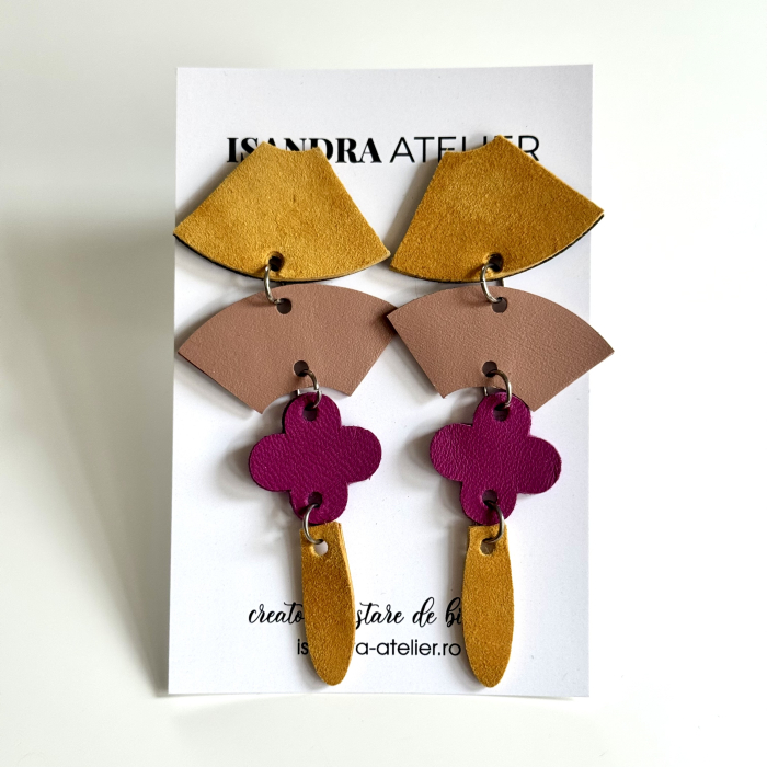 Cercei din piele naturala colorati, lucrati manual cu design geometric si finisaje atent realizate. Avand prindere cu tija si surub, cerceii acestia sunt creati pentru a fi purtati zilnic , adaugand un accent de culoare si personalitate fiecarei tinute.