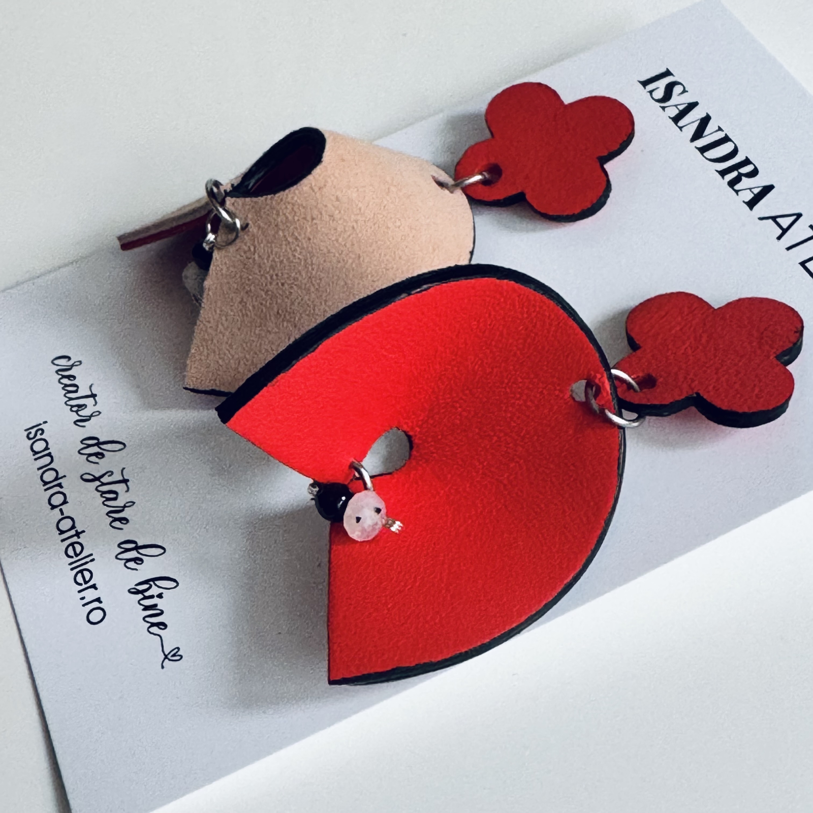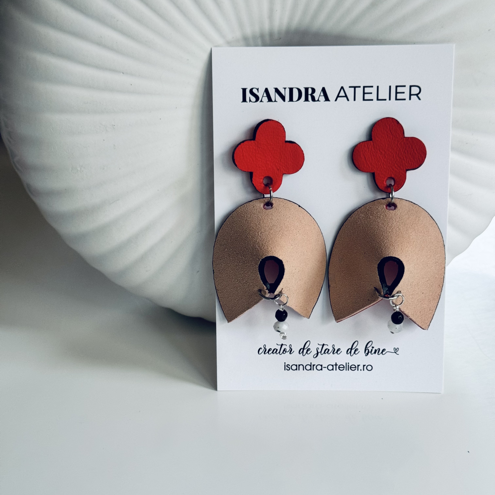 Cercei din piele naturala in forma geometrica, sub forma de oval deschis, creati integral manual. Canturile sunt vopsite cu vopsea speciala pentru canturi, atat cu rol estetic cat si pentru protectie impotriva murdaririi.