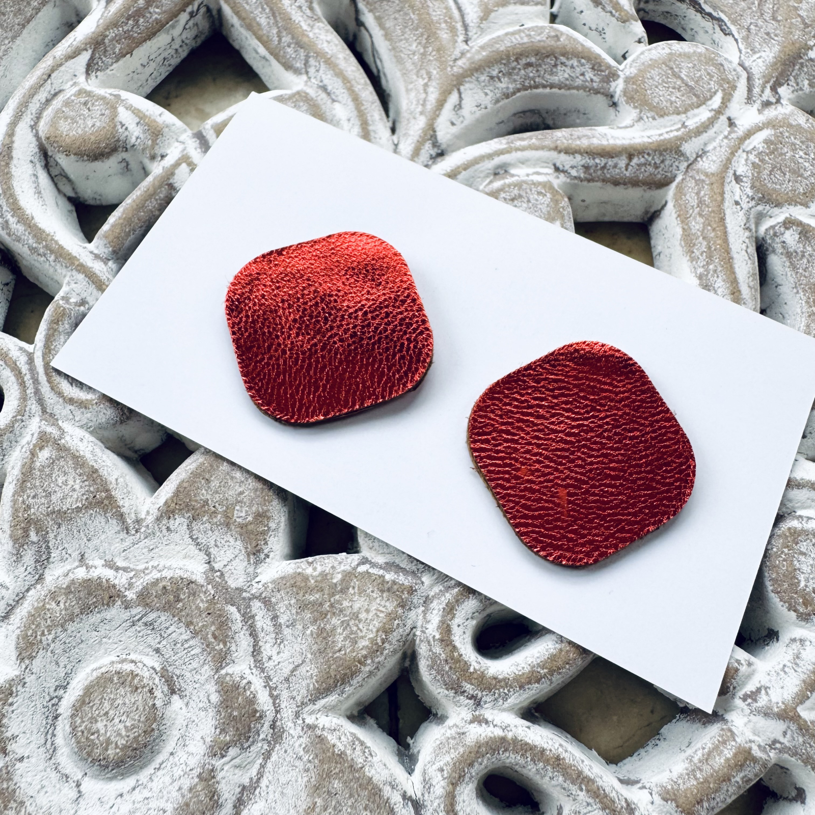 Cercei piele naturala, patrat rotunjit, diametrul 3cm, rosu astralucitor
