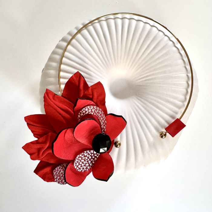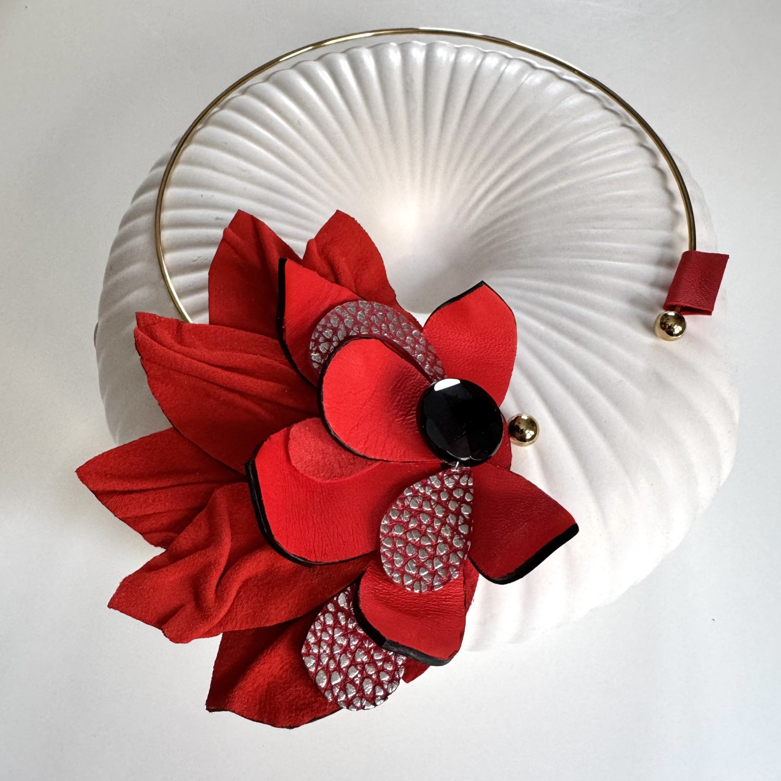 Colier din piele naturala floare fantezie rosie si piatra mare de onix. Fiecare petala si element din piele naturala este taiata si prelucrata manual. Elementul floare este montat pe un colier fix din inox placat cu aur de 18K. Piesa este unicat. La cerere se poate reface insa numai ca si concept fantezie, produsul nu poate fi identic.