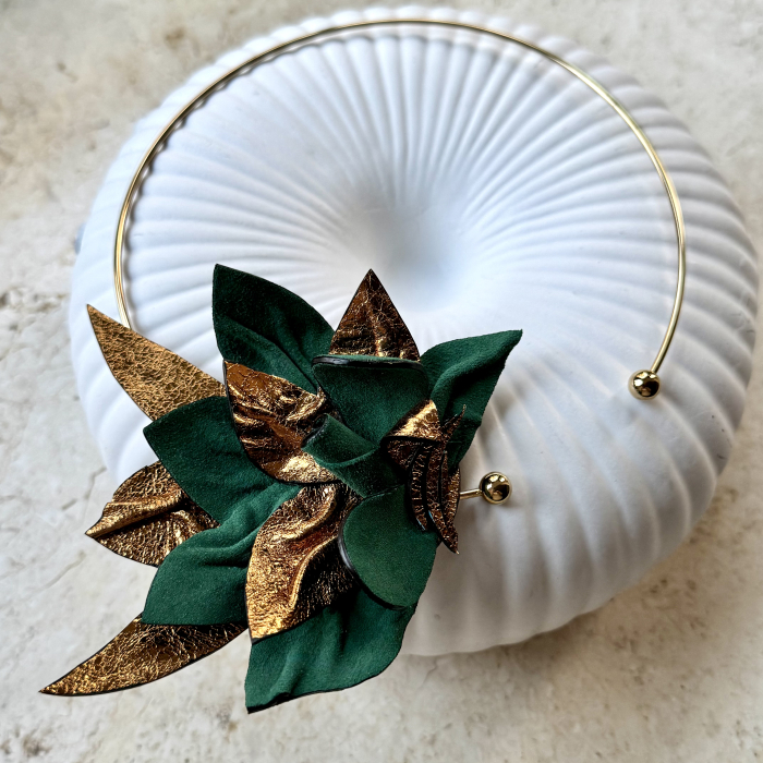 Colier din piele naturala floare fantezie verde si auriu-bronz. Canturi vopsite manual. Fiecare petala si element din piele naturala este taiata si prelucrata manual. Elementul floare este montat pe un colier fix din inox placat cu aur de 18K. Piesa este unicat. La cerere se poate reface insa numai ca si concept fantezie, in clorile existente in stoc, produsul nu poate fi identic.