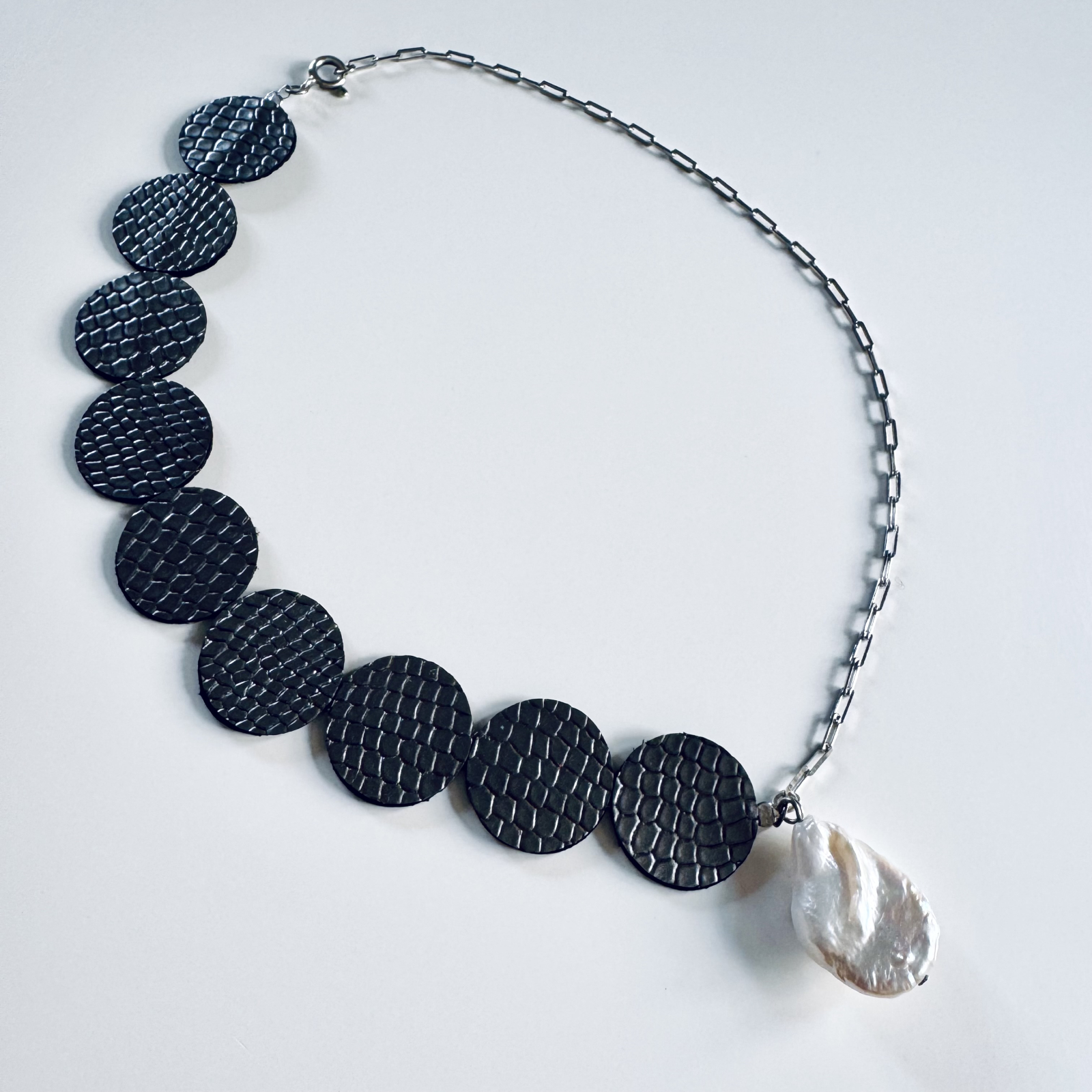 Colier din buline decupate de piele naturala gri metalizat si lant din argint 925, o perla baroca cu irizatii roz
